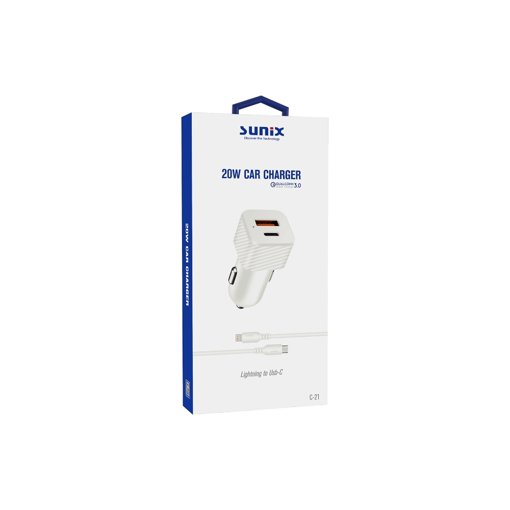 SUNIX C-21 20W 3.0 LİGHTNİNG ARAÇ ŞARJ SETİ, Apple cihazlarınız için ideal bir araç şarj cihazıdır. Ürün, yüksek kaliteli malzemelerden üretilmiştir ve size güçlü ve güvenilir bir şarj deneyimi sunar.