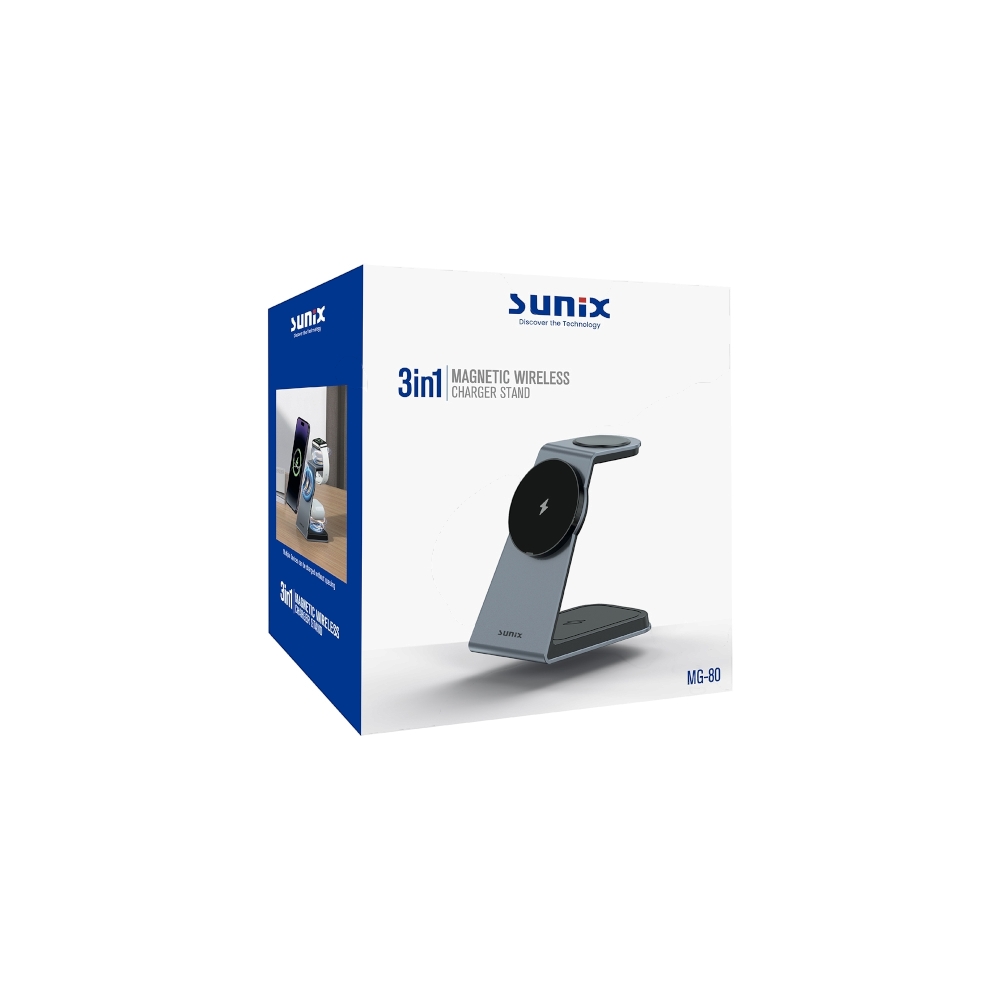 - 3-in-1 Tasarım: SUNIX MG-80, aynı anda üç cihazınızı şarj etmenize olanak tanır. Akıllı telefon, kablosuz kulaklık ve akıllı saatinizi sadece bir platform üzerinde hızlı ve güvenli bir şekilde şarj edebilirsiniz.